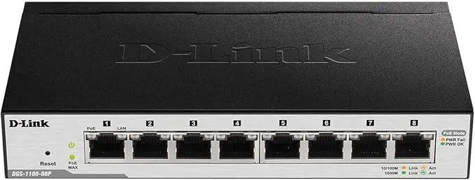 El Switch D-Link DGS-1100-08P está diseñado para ofrecer un rendimiento confiable y eficiente en redes que requieren conectividad Gigabit y alimentación PoE. Dispone de 8 puertos RJ-45 LAN GbE con PoE y tecnología Auto MDI/MDIX, asegurando una transmisión de datos estable y de alta velocidad.